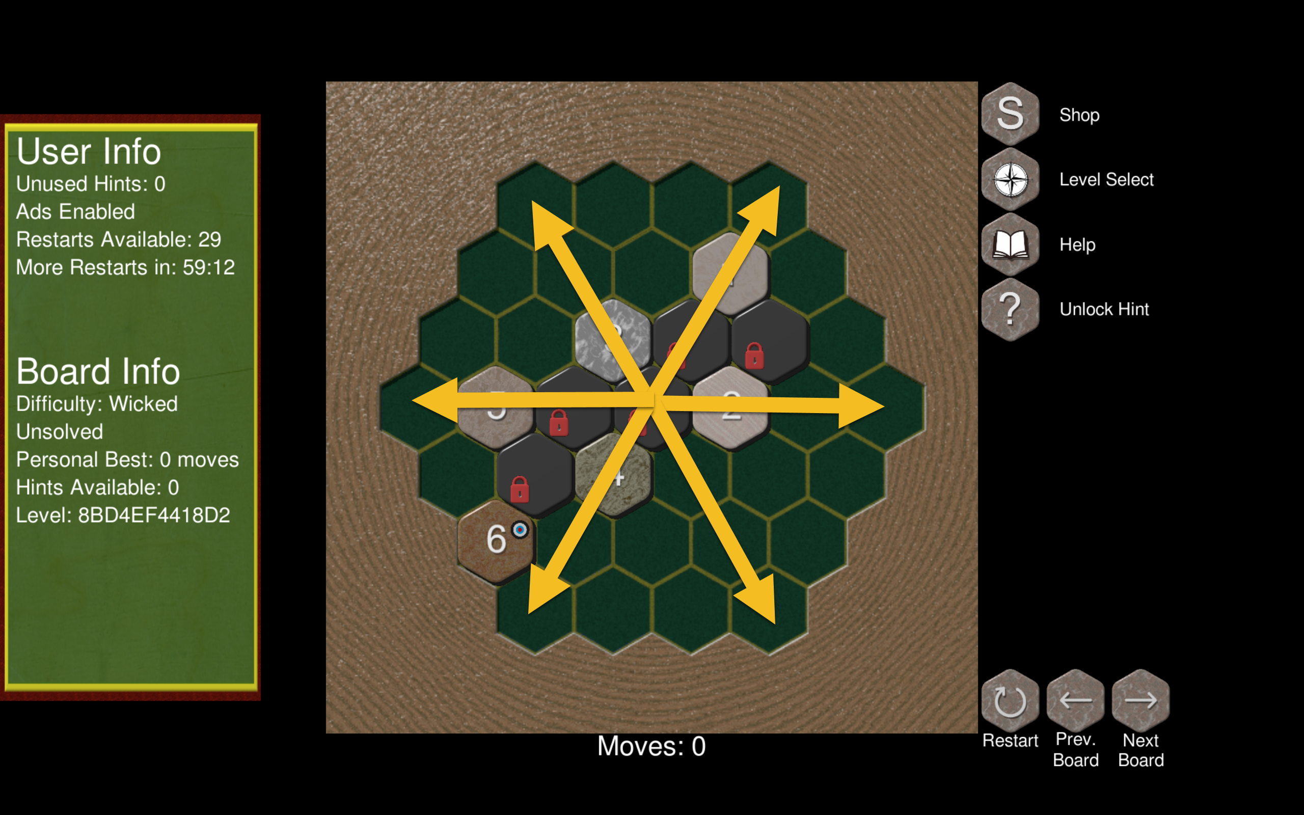 Once purchased, hints can be used on any level to show you moves toward a solution. The level remembers how many hints you've applied to that level and allows you to replay them in the future.