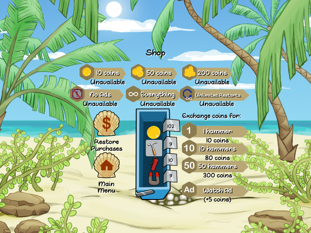 The shop allows you to buy coins which you can exchange for other things. You can buy 10 coins, 50 coins, and 200 coins at a time. Prices vary depending on the currency and what region you live in. You can purchase tools like hammers, bombs and magnets by selecting the item you want to purchase from the tool box then choosing the number you want to purchase. If you choose not to buy coins, there's an option to watch ads in return for 5 coins. If you upgrade or change the device you play on, the shop offers a Restore Purchase option. In the game, you can use 2 coins to step back by one move. You can press Skip Level and either skip to the next level for 10 coins or show the solution for this level for 15 coins. Once you show the solution for a level, you can see the solution for that level for free in the future.